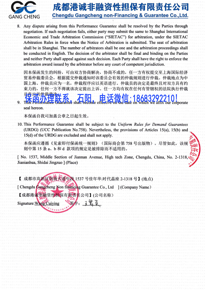 中英文獨(dú)立格式履約保函/2024擔(dān)保公司保函案例一